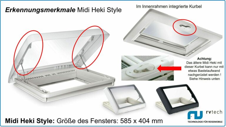 Der Dachfensterantrieb von RV Tech ist unter anderem für Dometic HEKI 3 und HEKI Midi Dachfenster geeignet. Je nach Fahrzeug und Fenstergröße stehen passende Varianten zur Verfügung.